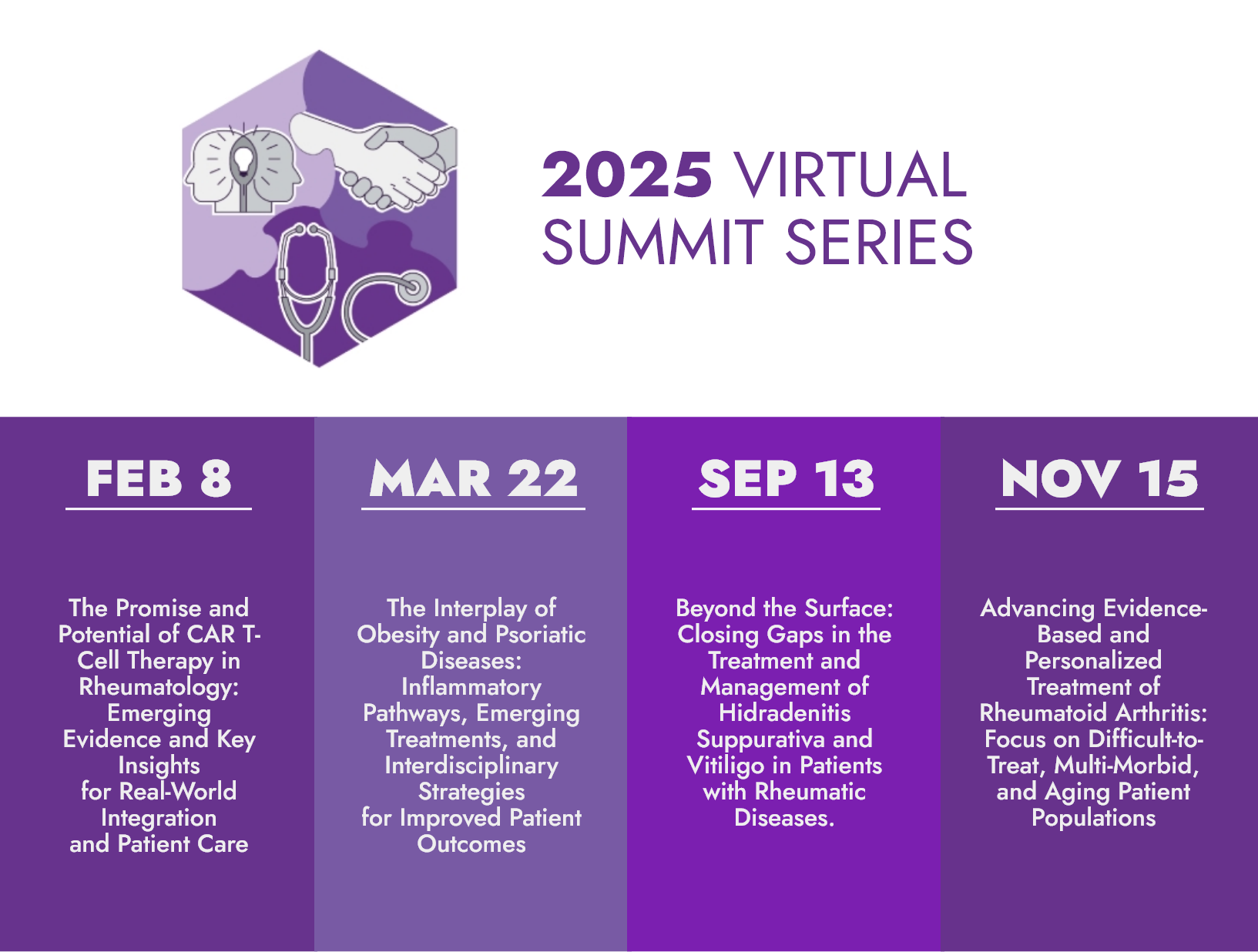 In our summits, our expert speakers and engaging sessions will equip our attendees with the skills and knowledge necessary to align their practice with evolving evidence, so they are better prepared to provide optimal and equitable care for all their patients with rheumatic conditions.